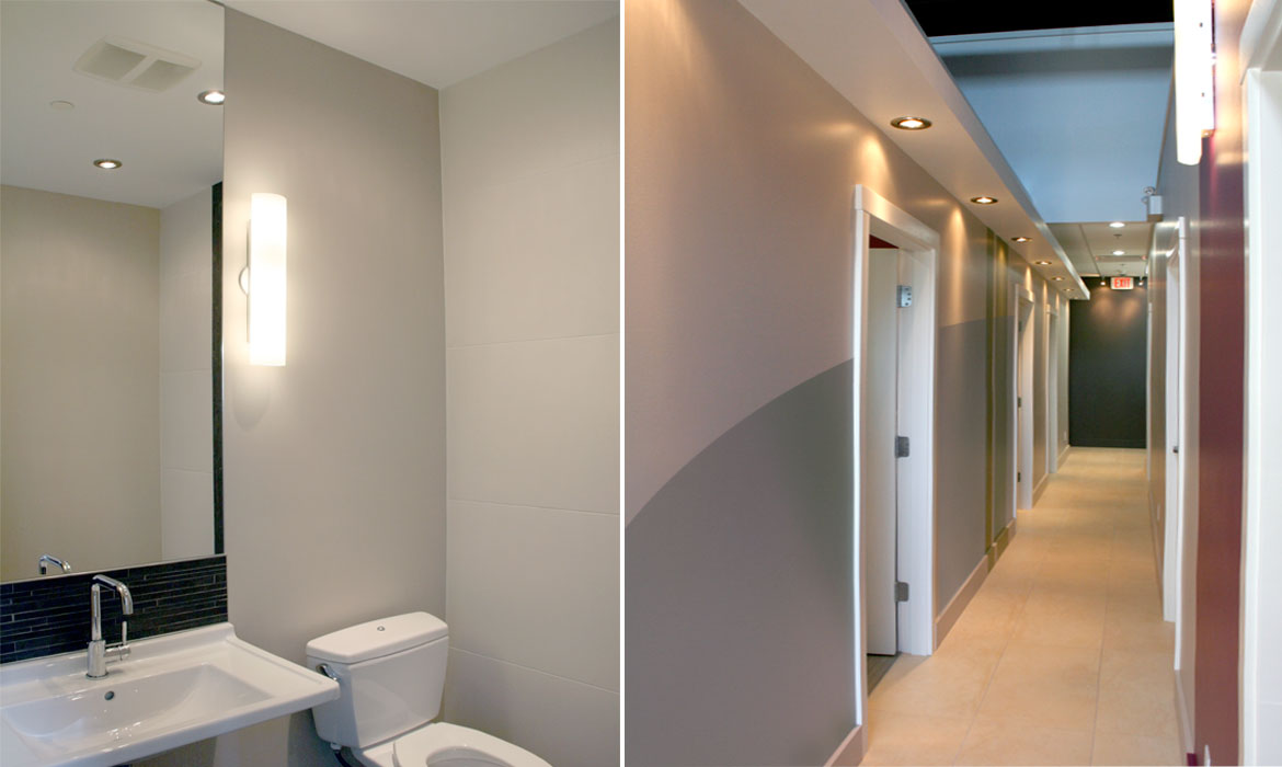 A high ceiling space in a retail strip mall was designed into a medical clinic. The program required a number of private examination rooms and a waiting area. As an obstretician clinic, the space was designed to feel "home like", in an effort to provide a sense of comfort and tranquility for expectant mothers. Colours and simple massing helped create a human scale along the long access corridor that serviced the examination rooms. Furnishings and fixtures were selected from residential demolitions, and re-purposed for this clinic.