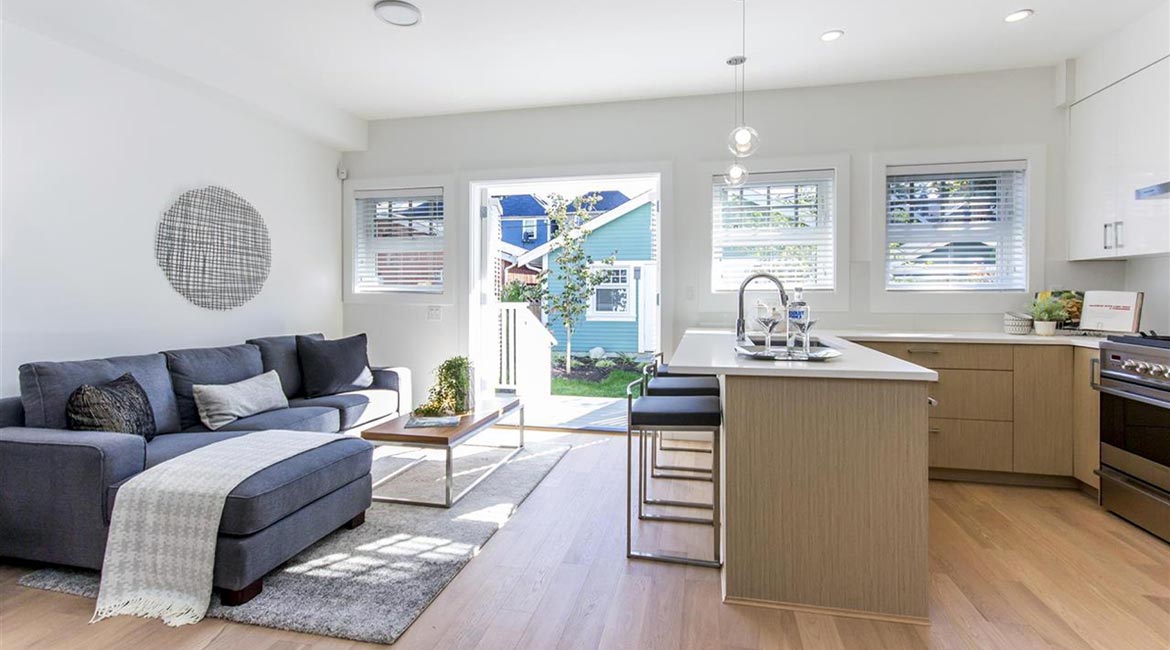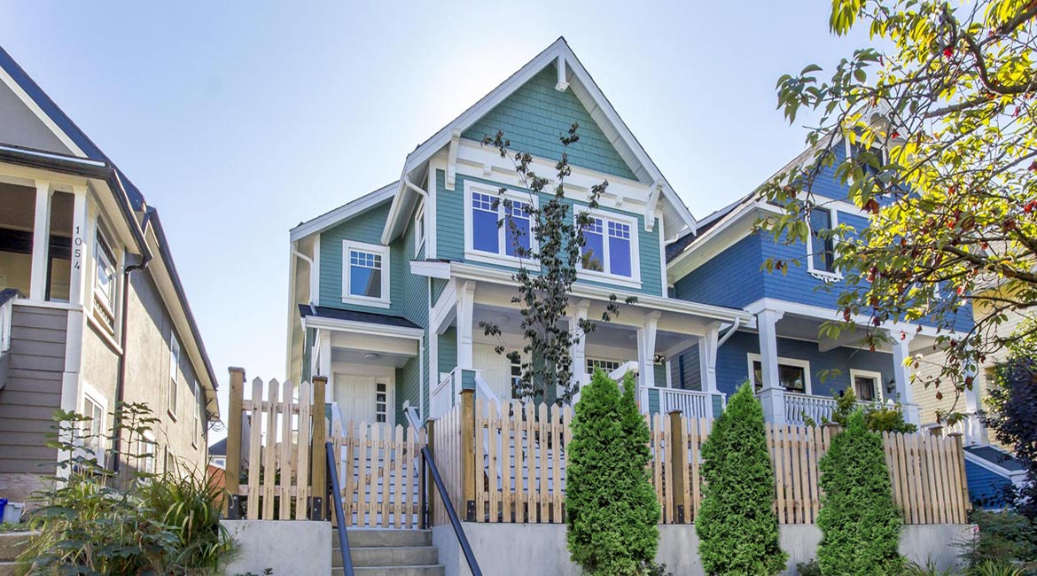 This duplex home was designed for fairness for the families living in each home. Here was the challenge: duplex homes are often built back to back, or side by side. A "back to back" results in only one home with a front door… while the other home with just a back door entry. The "side by side" layout results in two long narrow units. The duplex homes in this design were placed such that both homes had a front door with street presence, and both had a back door opening to a shared backyard garden.