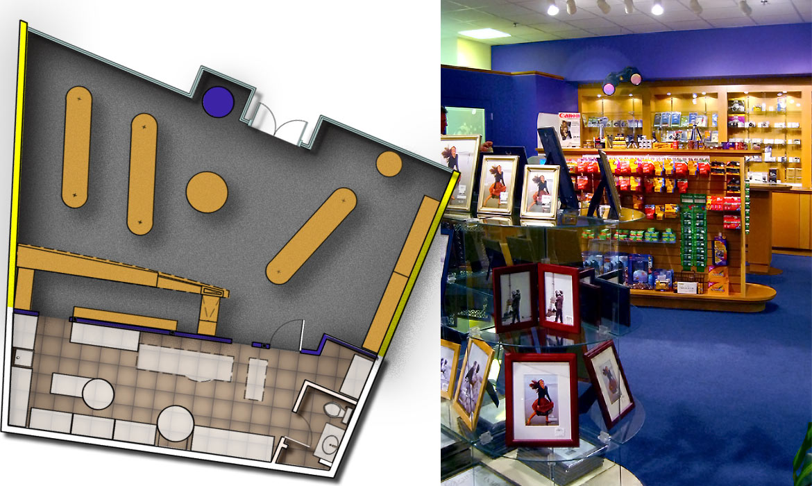 Located in a shopping mall next to a cruise ship terminal and a large downtown office population, this store used vivid colours as a visual cue for its sales and specialty service. Strong colours and inexpensive materials were an effective solution to a limited budget. Display shelving were prepared from industrial grade materials, finished with a light stain, exposing its intrinsic texture, to complement the store's colour scheme and simple finishes.