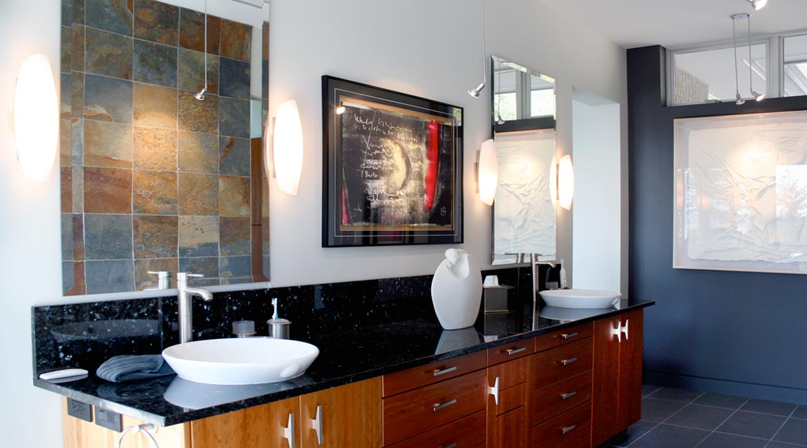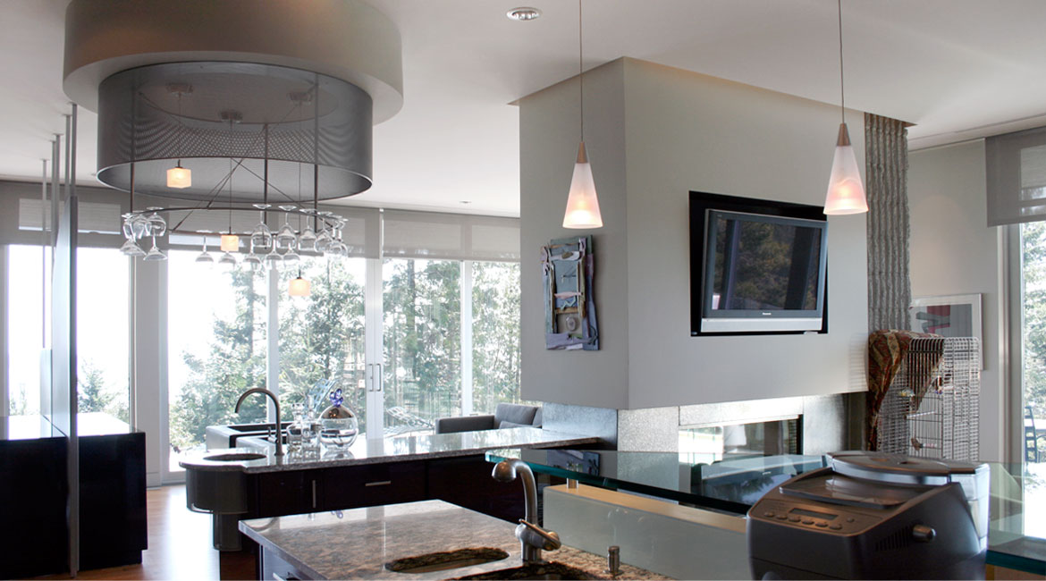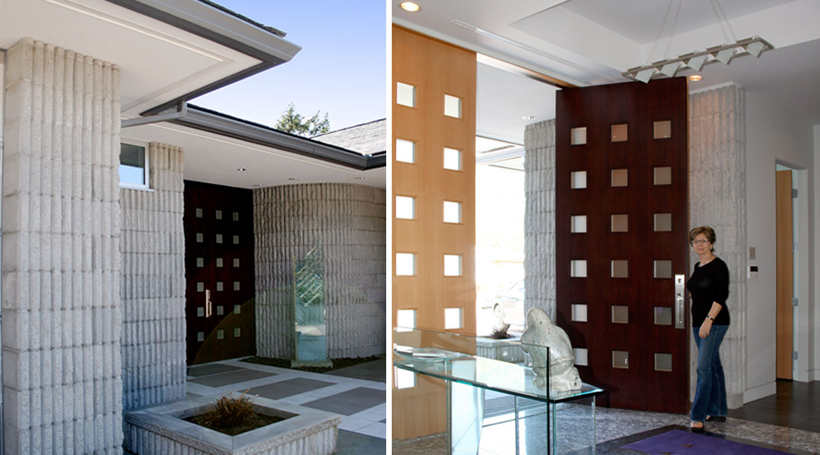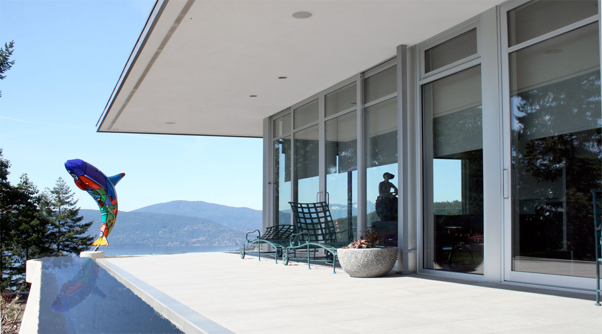 Nestled amongst granitic rock formations along West Vancouver's rugged coastline, this home overlooks the Salish Sea. To acknowledge its natural setting, the home's exterior is finished with split face concrete blocks for its colour and texture. As a finish material, concrete has intrinsic qualities of energy efficiency, fire resistance, moisture management, and ease of maintenance. This exterior finish continues into the home to help connect it to the outdoors.