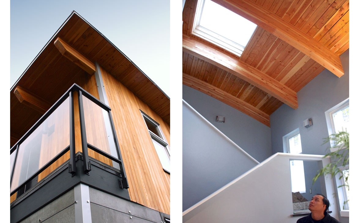 A curved roof form represented the organic nature of sound, and the amplification of sound. The roof form, akin to a concave mirror, helped distribute daylight from a skylight over the stairwell. Living, dining, kitchen and a bathroom were placed on the main floor. The second floor has two bedrooms and a full bathroom, with two exterior deck areas. The open floor layouts helped create a sense of spaciousness.