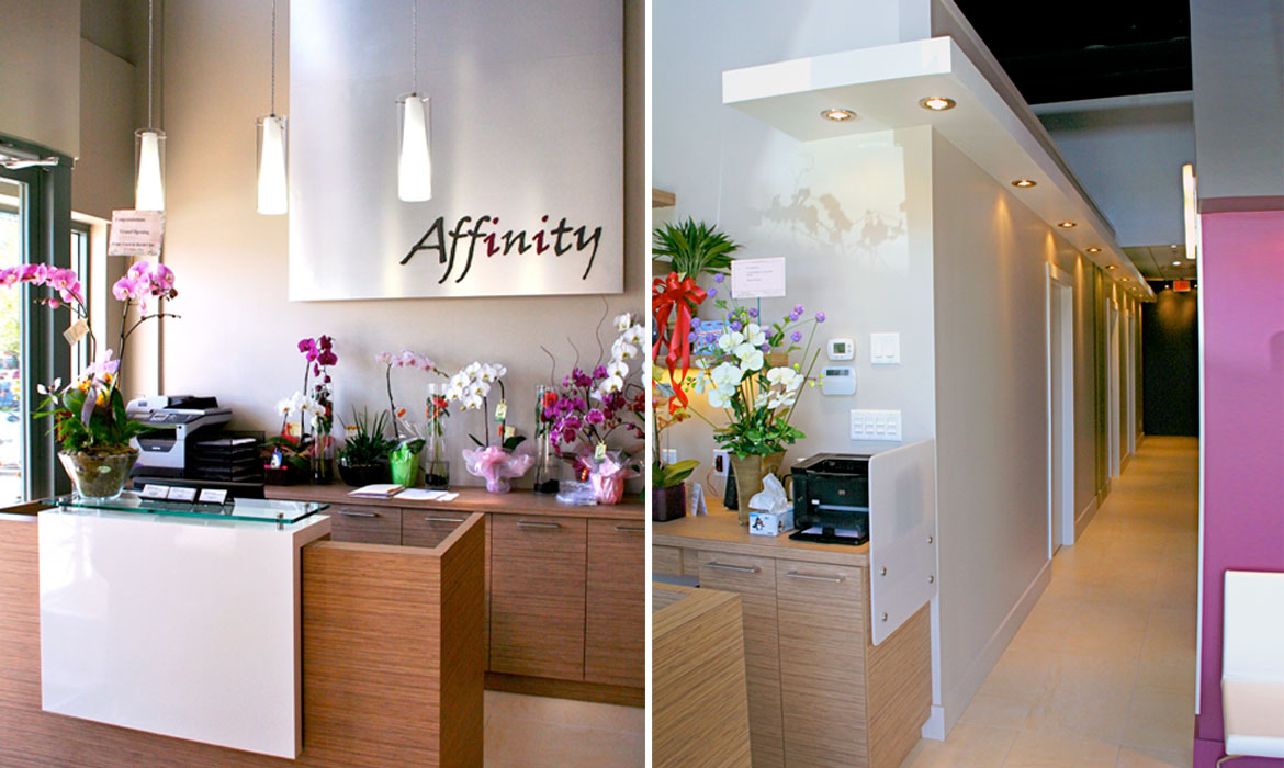 A high ceiling space in a retail strip mall was designed into a medical clinic. The program required a number of private examination rooms and a waiting area. As an obstretician clinic, the space was designed to feel "home like", in an effort to provide a sense of comfort and tranquility for expectant mothers. Colours and simple massing helped create a human scale along the long access corridor that serviced the examination rooms. Furnishings and fixtures were selected from residential demolitions, and re-purposed for this clinic.